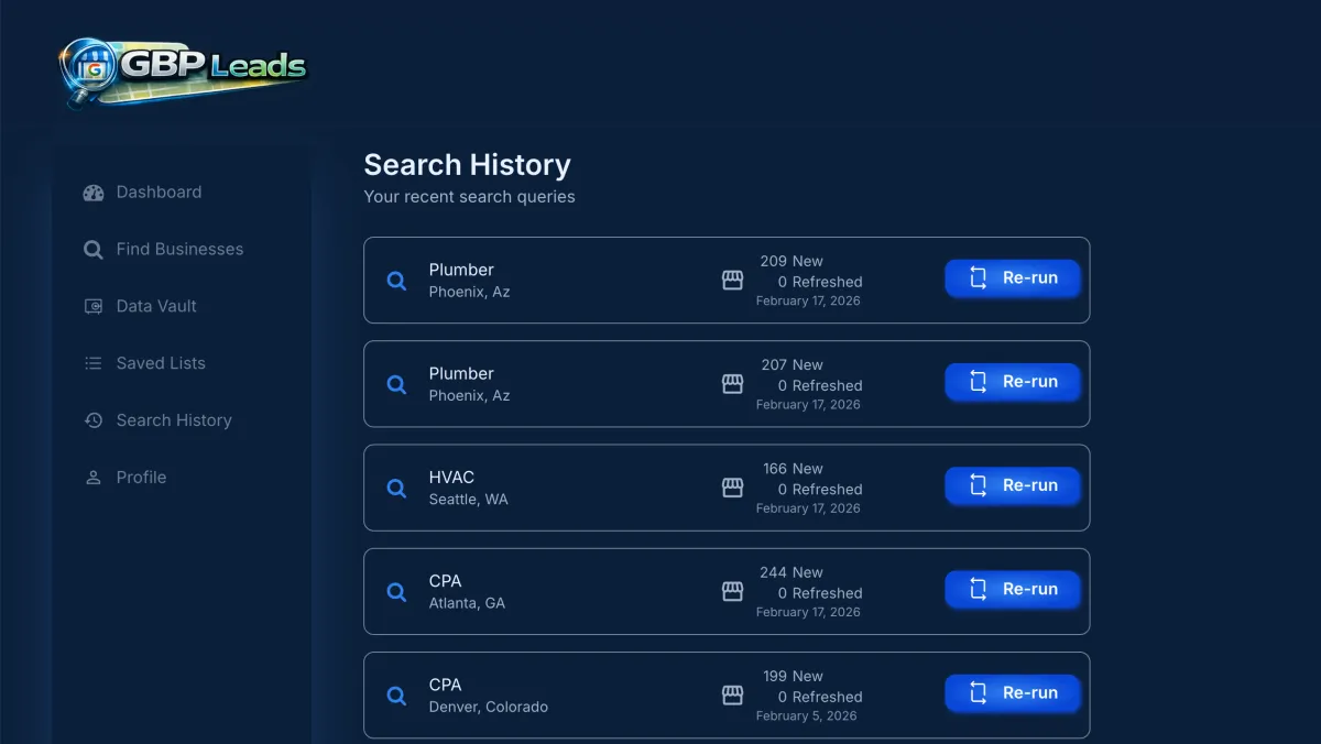 Refresh any past search and GBP Leads automatically updates the existing businesses in your vault and surfaces new businesses — no duplicates, no manual cleanup, no starting over.